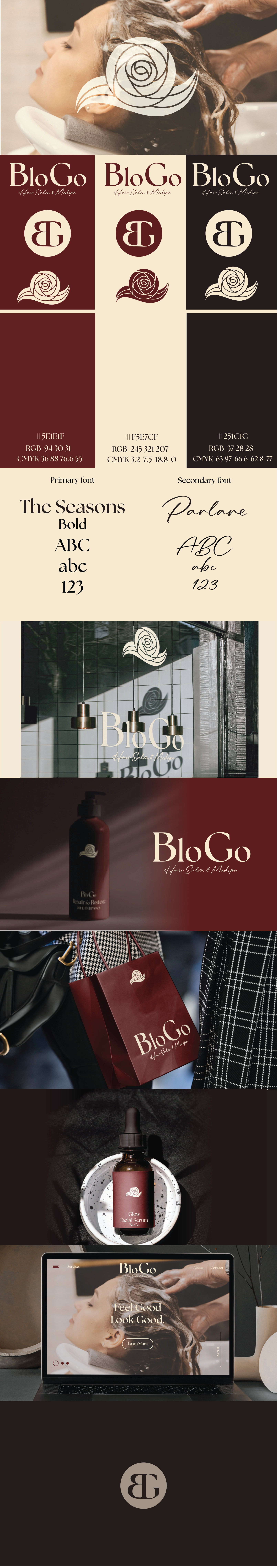 BloGo's branding is very minimalist, with a simple black-and-white color theme. The typography used is also a simple serif and sans-serif font. What I want to provide for the company's rebranding is to give it a personality and a warm, inviting color palette. This is in contrast to the sterile one they have now. Changing the font to serif and script one. I want to reflect the local environment in the rebrand. A dark red with warm black and whites reflecting the colors of Alabama. Another is using a camellia as one of the logos.